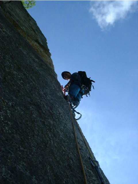 7ピッチ目、アニマルさんリード。3回アブミを掛け替えると恐竜カンテを乗越す。高くなりはじめた太陽がとても眩しかった。遠目のピンも、手長サルの原は二段目で届いた。後はひたすらアブミを掛け替え、立木のあるテラスまで。30mでコール。