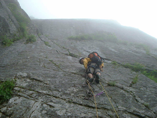 2ピッチ目、アニマルさんリード。テラスから見えるディエードルの入口はフレークが豊富でせいぜいV級にしか見えないが、回り込んだところから見事なコーナー・クラックが上まで続いている。乾いている時なら快適にレイバックが決まるのだろうが、雨の中、濡れ濡れの壁に足を突っ張る事はできず、原はフットジャムを中心にスタンスを決める。おかげで地獄のように足が痛かった。45m位延ばし、支点とも言えないクラックラインの途中でカム×3+ハーケン1を使って切る。