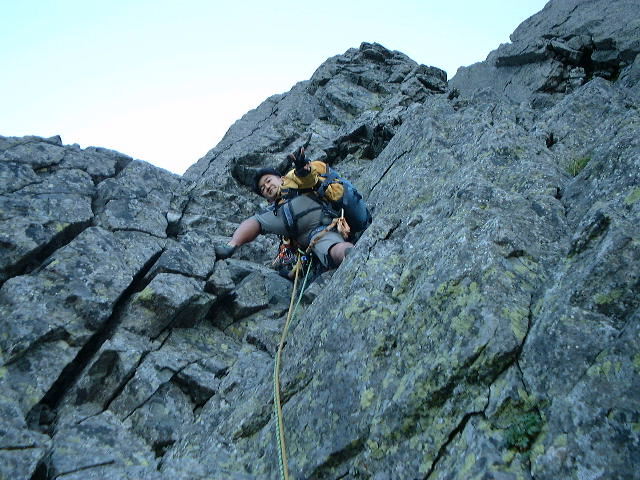 塚本、原は朝のお仕事を済ませ、登攀開始。3人なので、原がオールリードで二人を引っ張る。5時20登攀開始。