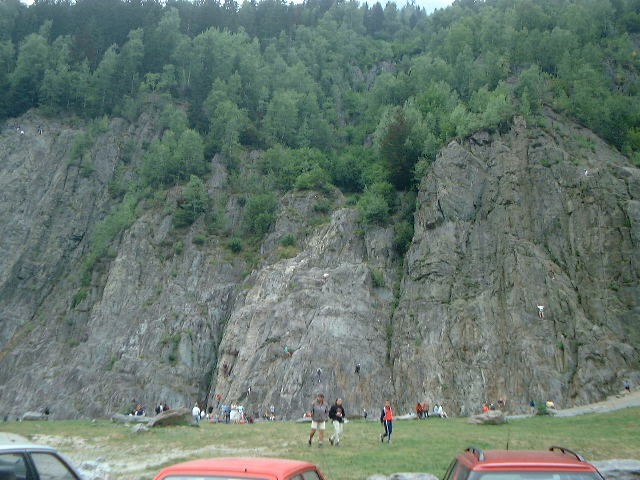 ガイアンの岩場はシャモニの中心部からジュネーブ方面に1.5kmくらい(たぶん)行ったところにある。MIDI側の大きな国道ではなく、ブレバン側の細い通りに面している。岩場の基部は芝生の広い広場になっており、トイレもあれば駐車場もかなりのスペースが確保されている。いわゆるゲレンデだけど、日本のゲレンデでこれだけ整備されているところってあるかな・・・。おそらく行政が整備しているのだろうけど、日本とは考え方が随分ちがうなと思った。ま、日本だと行政が整備してこういったものを作ると、万が一事故が起こったときに「行政の管理責任だ!」とかいって被害者が騒ぐから行政も手をつけないのだろうけど・・・。