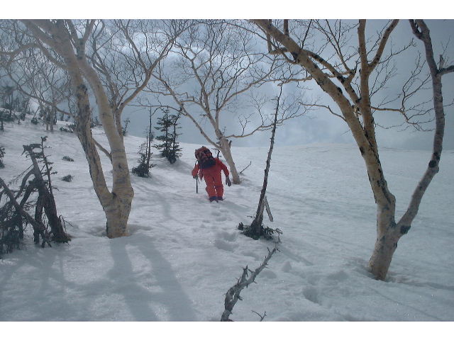 いきなり結構な急登であるが、ウォーミングアップには丁度良い感じ。この斜面の雪は大方解けていて、ザレた砂の道は非常に歩きにくかった。30分ほどの急登で稜線に出て、ここからは樹林帯の尾根を進む。ところどころ腿あたりまではまる雪がわずらわしいが、まだ体力も十分で気持ちが良い。尾根はたおやかでかつ明瞭で、ところどころマーキングも現れるので迷うことはない。身体も温まってきて樹林帯を吹き抜ける風が気もち良い。ところどころ休止を交えて高度を稼いだ。