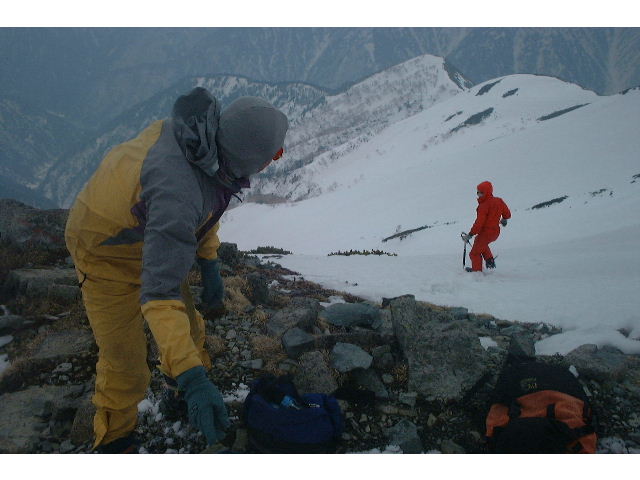 ここで作戦を練る。一応当初は1泊して赤岩尾根を下ろうかということになっていたが、時間は昼前だったので日帰りすることに決定。重たいテントや炊事道具などはここに残置し、ピークを往復する。恩田さんは水は行動食をすべてポケットの中にしまい、空荷であった。