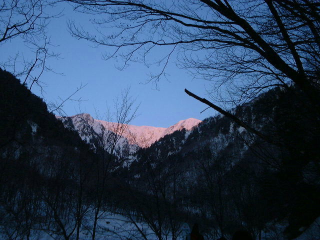 <大冷沢を詰める。朝日に照らされる布引岳>