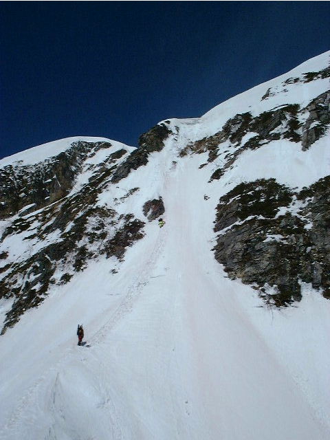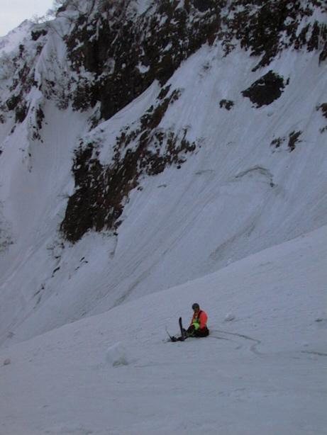 100mくらい滑ると、左からルンゼを合わせ、傾斜も若干緩くなる。でも、両岸の岩壁からの小雪崩れでデブリができており、滑りにくい。