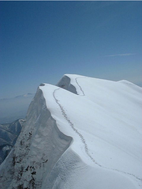 <東尾根上の我々のトレース。荒沢側に雪庇が発達している>