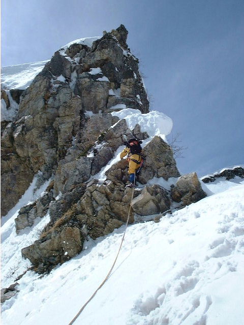 岩峰基部には数段上がったところに何本かハーケンがあり、アンカーにできないこともないが、まだ雪がべっとり残っているので、不安定な岩間より安定した雪面でスタンディングアックスビレイをすることとした。