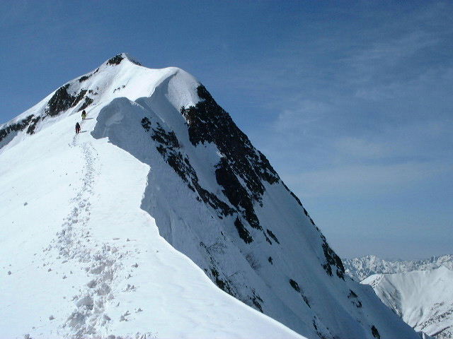 終了点から稜線を目指して雪壁を行く。季節が進めばここの雪も落ちて、ハイマツ帯になるのだろうが、まだ傾斜の緩い雪壁であった。第1岩峰よりは傾斜が緩いので、雪の緩みもあまり気にならなかった。稜線に上がると、ところどころ荒沢側に強烈に雪庇が張り出したナイフエッジとなり、第2岩峰にたどり着く。第2岩峰は思ったより立っていた。