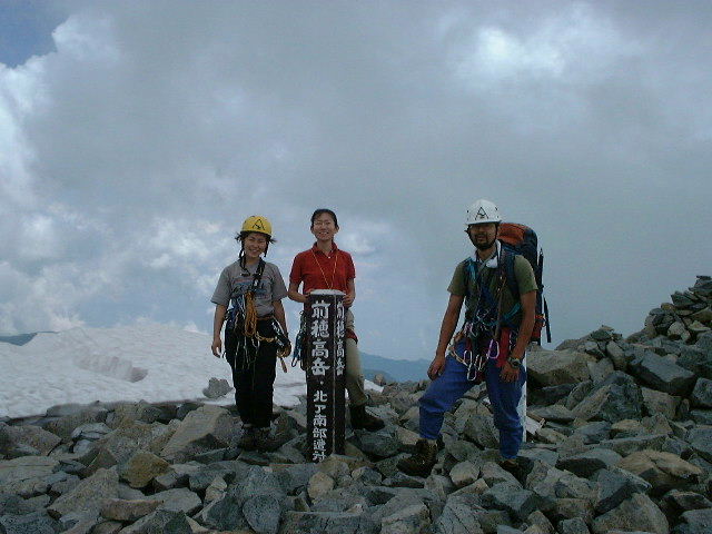 <前穂の頂上で。左から豊嬢、石崎嬢、鈴木>