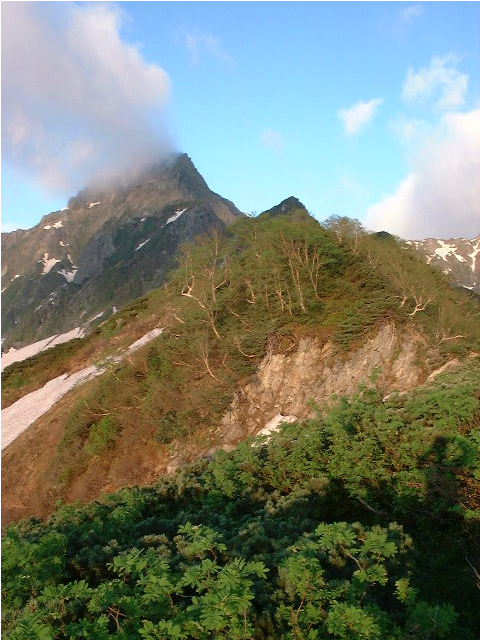 小ピークはナイフエッジとなっており、すっぱり切れた壁にぶち当たる。岩にはシュリンゲが何本もかかっている。周りをよく見るが懸垂しかなさそう。ガイドブックには下半は常念山脈の縦走気分で歩けると書いてあったが、大嘘だった。たぶん1998年の大地震の影響で道が崩壊し、こんなに悪くなったのだろう。そういえば、あの年は地震の最中、北鎌に行ったのだった。その時のパートナーの酒井は今はだれかさんの影響で自衛隊に入ってしまった。