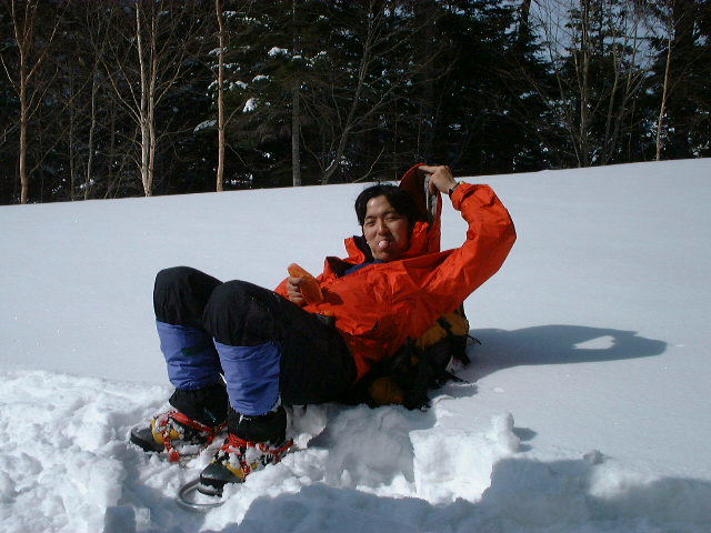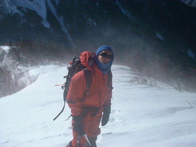 <駒津峰への登り。サングラスであやしいイチロー。風邪が強い>