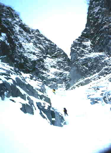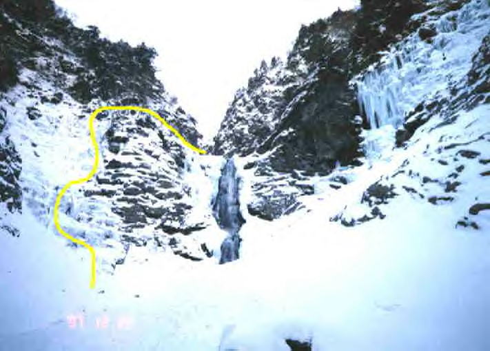 なんと、さらに2つの氷瀑が我々を待ちかまえていたのだ。共にそんなに高さもなく傾斜も緩いのだが、氷がしっかりしておらず(素人の僕にとってみれば)いやらしい。おまけに持っている物がおもちゃバイルであれば「またか・・・」というのが本音だった。それに2つのうちの滑滝と呼ばれる滝は記録にも明記してあるのだが(しかし記録には、雪に完全に埋まるので楽にクリアできると書いてある!)、もう一つの氷瀑は記録にはない。たぶん今年はそれまで雪があまり降っていなかったから、いつもなら雪に埋まるところが、むき出しの氷になってしまっているのだろう。滑滝の手前にはとてもきれいなスノーブリッジが残っていて、その下を意気揚々と進んでいたのに、突如現れた雪に埋まっていない滑滝の姿には少々唖然としてしまった。