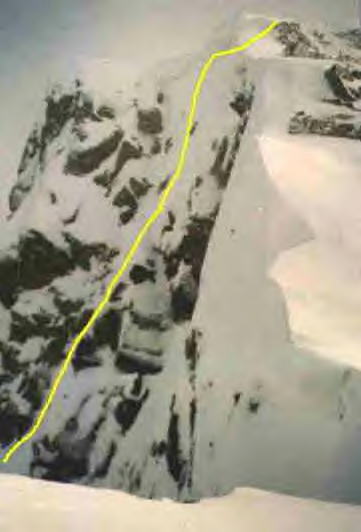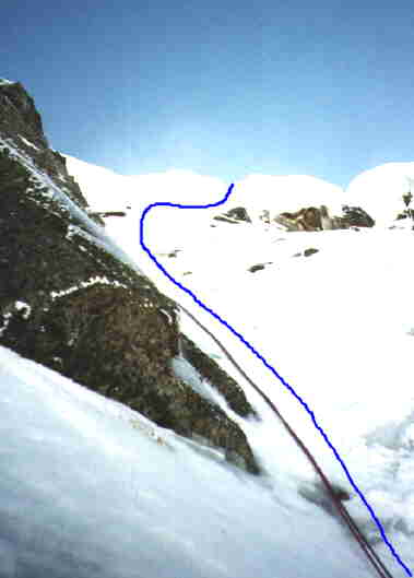 <最後の雪壁の全景。黄色のラインが我々のトレース>