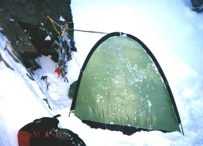 ビバーク場所に決めた地点に、最後の力を振り絞ってはいあがり、ザックをおろす。陽が落ちてしまうので、急いでピッケルで雪面を平らにならし、テントを張る。岩壁にハーケンを打ちつけ、シュリンゲでテントを固定する。こうしておけば、少しくらいの雪崩なら飛ばされはしないはずだ。