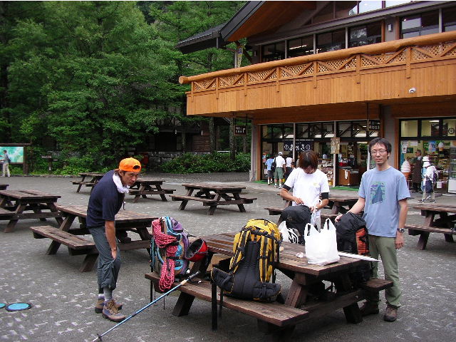 上高地に着き、バスターミナルで永田さんと落ち合う予定。唯一永田さんと面識のある雨宮さんが発見して声をかけ、晴れて凸凹パーティーが出来上がった。