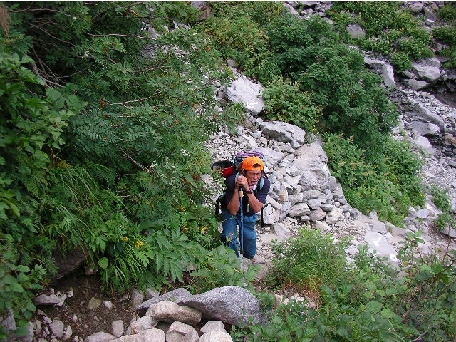 しかし雨宮さん絶好調で早い早い・・・。この人は本当に大学の先生なのかしらというくらいで、平然と競歩ばりに闊歩し、それに国体選手の永田譲が続く。原も石田さんも懸命に追うという感じで、おかげで1時間半程度で横尾に到着してしまった。