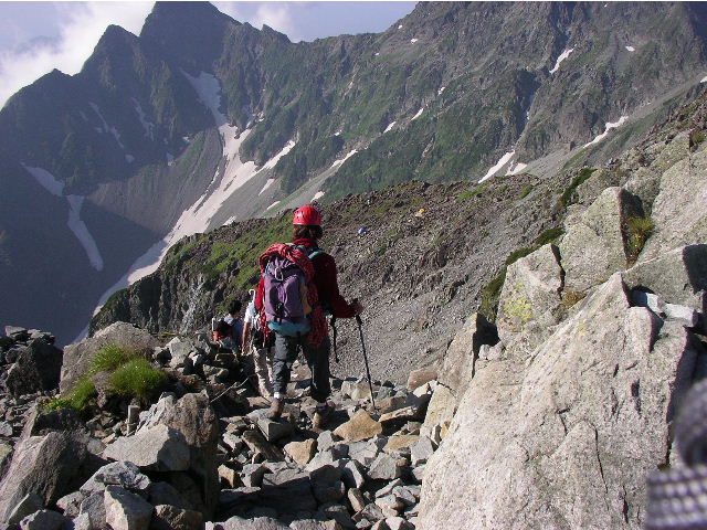 休止をしてさらに歩き出す。なんたって今日中に北穂まで行くのだから、先を急がないと。しかしここから石田さんが急激にペースダウン。永田嬢と雨宮さんはあいかわらず飛ばす。原はその間で自分のペースを維持。しかし今回はほんとうにチキチキバンバンレース、っちゅう様相であった。