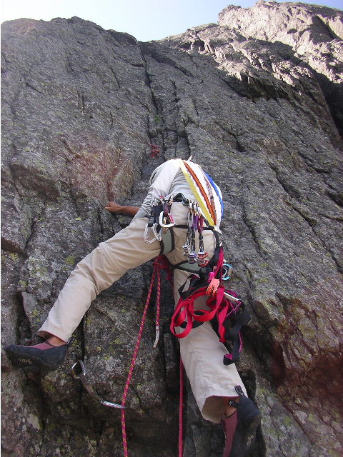 1ピッチ目 4級A1。ピトン間隔はまったく人工登攀用であるが、永田さんフリーで取り付く。出だしは少しかぶり気味でレイバックちっくに体を振って行く。それを越えるとすっきりしたフェースだが、たてホールドが多くて結構きわどい感じ。永田さんは12クライマーだけあってさすがにスムーズに進むが、フェースの核心のあたりでつまっていたので、「時間がないからA0して早く進んでくれ」と叫んでA0をさせてしまった。トポには45mと書いてあるが、25m程度で切れるテラスが現れ、ここで切る。原も最初はフリーでがんばったが、すぐに詰まり、上にいる永田さんから「時間がないですよ〜、人工してくださいよ〜」と声がかかりアブミを出す。