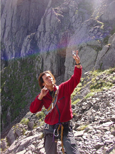 北壁基部の広いテラスで北壁を見上げ、さて、どこを登りますかねぇ、と悩む。まえはチムニーに入り込んでいく右ルートを登ったので、今回は左ルートへ。永田さんがザイルを忘れたため、4人で3本のザイルを繋ぎ、一人リード、あとの3人でフォローすることにする。北壁は前にオールリードで登った事もあるので、フリーの上手い永田さんがリードで取り付く。