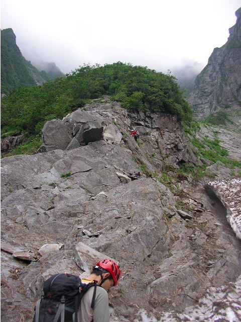 中央稜取り付きでは先行パーティーが多く順番待ちであった。しばらく取り付きで待ちつつ悩むが、南稜を見るとまだ先行は1パーティーのみ。それでは、と南稜に転進する。一路烏帽子沢をトラバース。