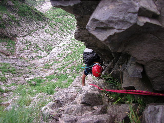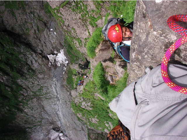 3ピッチ目の出だしのフェースを回り込んだところで先行パーティーに追いつく。下のビレイポイントでビレイ。石田さんを迎え入れ、ここで抜かさせてもらう。