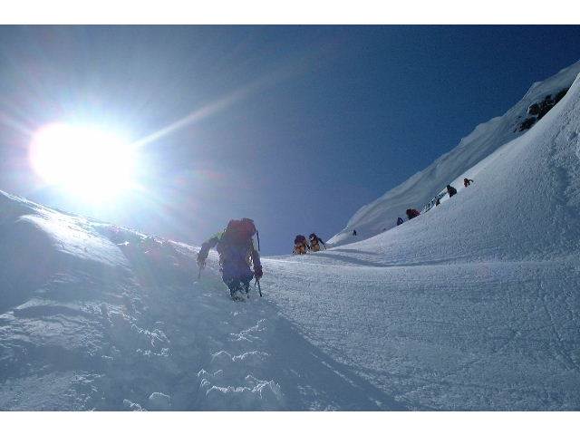 岩稜を越えるとひたすら雪稜を進む。途中、シュルンドがバックリ開いているところが何箇所かあって緊張する。やはり昨日から今日にかけて気温が高すぎるのと、数日前に降った新雪で状態は悪い。シュルンドをさけつつ、マチガ沢側に張り出した雪庇をさけつつトレースを刻み、進むと、2の沢本谷の最上部と合流する。2の沢右壁には小規模な雪崩が数回発生していた。気温が上がっている証拠。でも、11時を過ぎると、なぜか気温が落ち着いた感じだった。